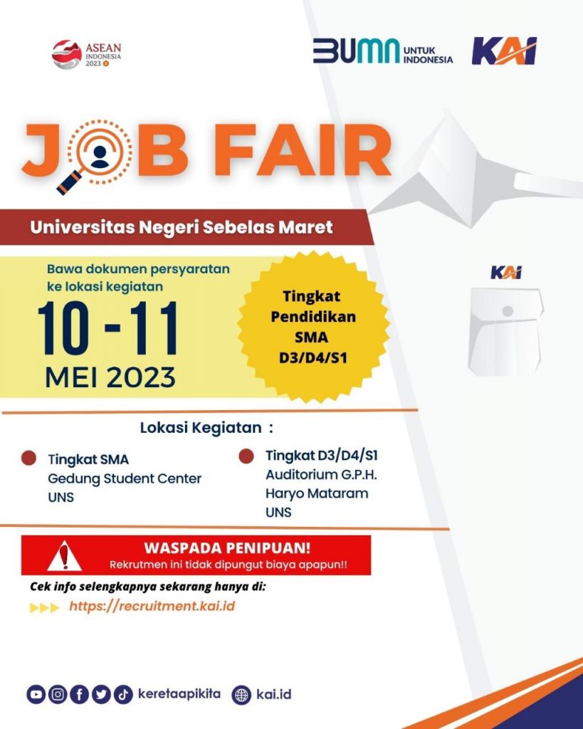 beritaKUH- PT Kereta Api Indonesia (Persero) membuka rekrutmen untuk berbagai formasi melalui Job Fair Universitas Sebelas Maret yang beralamat di Jl. Ir Sutami No. 36A, Jebres, Surakarta pada Rabu (10/5) dan Kamis (11/5).