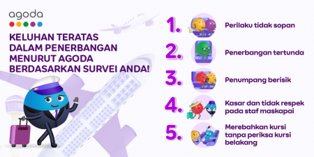 “Bagi sebagian besar dari kita, liburan yang menyenangkan dimulai sejak naik pesawat,” kata Liyana Jamil, Vice President of Global Partner Services, Agoda. “Meskipun terbang merupakan pengalaman yang menyenangkan, terkadang ada beberapa keluhan kecil. Ada lebih dari 130.000 rute penerbangan yang dapat dipesan di Agoda, dan saya berharap temuan survei ringan ini dapat menciptakan kesadaran, meningkatkan pertimbangan, dan membuat pengalaman di dalam pesawat pada salah satu dari rute-rute tersebut menjadi lebih menyenangkan.”