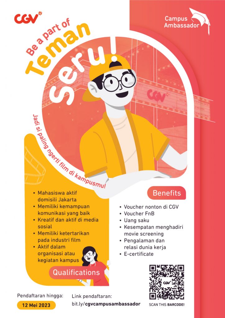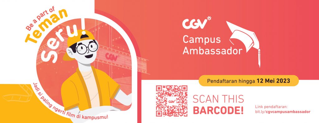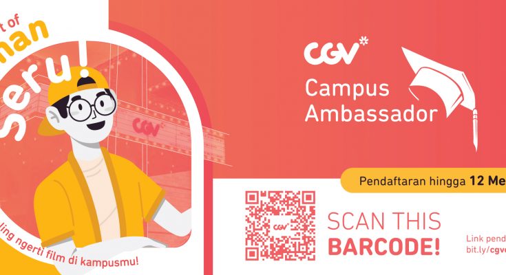 beritaKUH- Membuka kesempatan dan merangkul mahasiswa/i penonton setia di daerah Jakarta, bioskop CGV Indonesia menghadirkan CGV Campus Ambassador, yaitu program khusus bagi mahasiswa/i terpilih yang menjadi perwakilan dari kampus untuk memperkenalkan ragam film, jenis auditorium, varian FnB dan produk CGV lainnya kepada lingkungan kampus dan masyarakat luas, serta mendukung berbagai kegiatan di bioskop CGV.