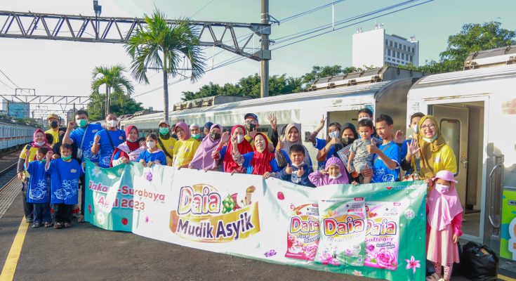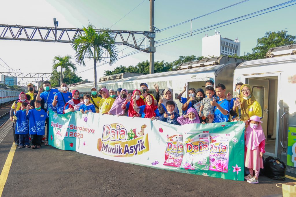 beritaKUH- Mudik Lebaran adalah salah satu budaya Indonesia yang dilakukan masyarakat untuk kembali bersilaturahmi dengan keluarga besar di tempat asalnya. Kegiatan ini lazimnya dilaksanakan menjelang hari raya Idul Fitri atau Lebaran dengan menggunakan beragam moda transportasi. DAIA, detergen bubuk no.1 di Indonesia produksi Wings Group, kembali memanjakan konsumen setianya dengan menggelar kegiatan DAIA MUDIK ASYIK. #DaiaMudikAsyik mengajak para Ibu untuk re-create / reka ulang foto Lebaran asyik mereka dan menceritakan momen seru tersebut. Ratusan konsumen Daia diberangkatkan dalam 6 gerbong Kereta Api Argo Bromo Anggrek dan Bima dari Jakarta dan Surabaya ke 16 kota di Pulau Jawa, juga sebaliknya dari Surabaya ke Jakarta pada tanggal 17 hingga 19 April 2023.