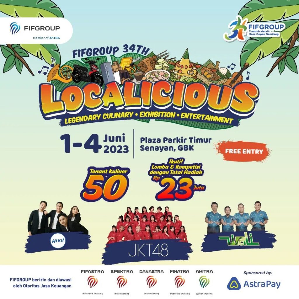 beritaKUH- FIFGROUP 34th LOCALICIOUS di Plaza Parkir Timur Senayan, Stadion Gelora Bung Karno (GBK) Jakarta, 1-4 Juni 2023. Gelaran ini merupakan puncak acara perayaan HUT ke-34 FIFGROUP yang menghadirkan berbagai keseruan untuk menemani pengunjung menghabiskan libur panjang pekan ini. Beragam kuliner dari 50 tenant kuliner legendaris nusantara dalam pagelaran ini akan menghadirkan penampilan spesial dari pengisi ternama Indonesia, yakni HIVI!, WALI, dan JKT48.