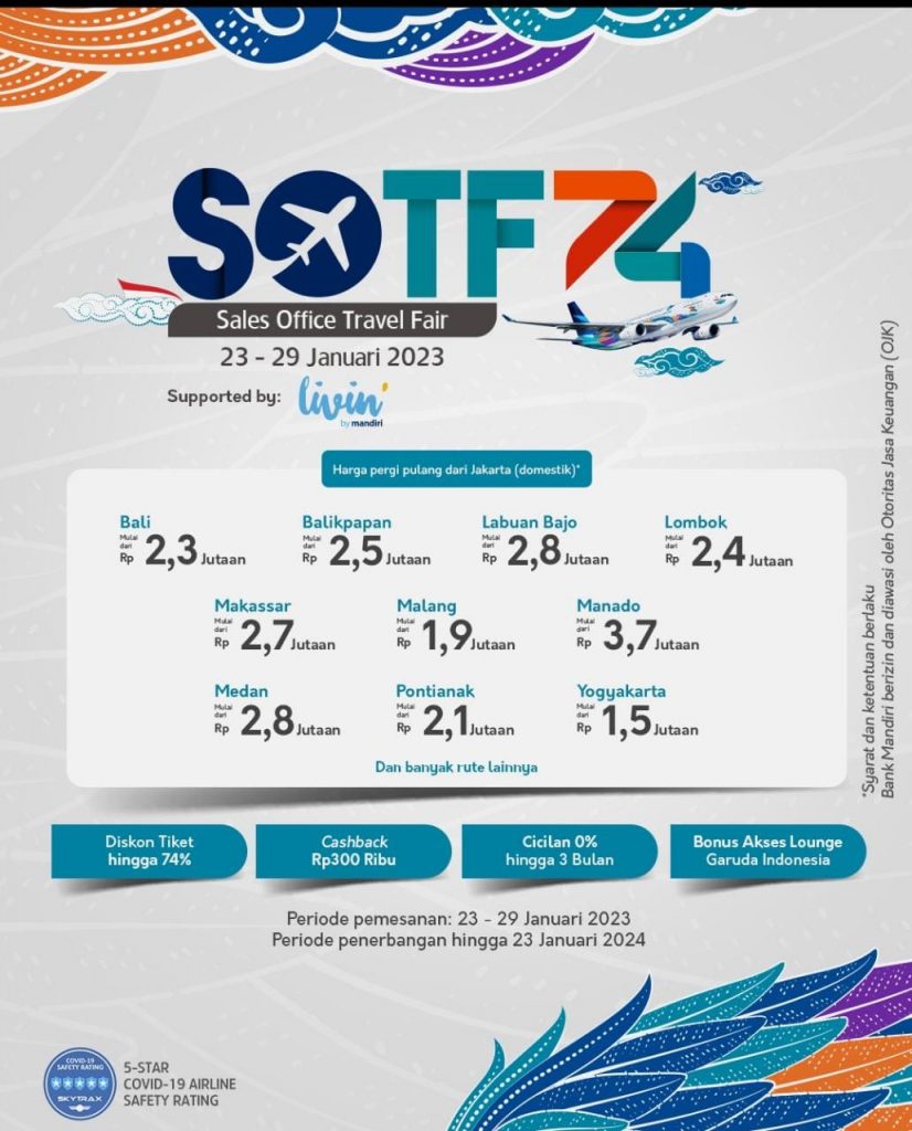 beritaKUH- Maskapai penerbangan nasional Garuda Indonesia menggelar Sales Office Travel Fair (SOTF) 2023 yang dilangsungkan pada tanggal 23 – 29 Januari 2023, sebagai bagian dari rangkaian program HUT ke-74 Garuda Indonesia. Melalui penyelenggaraan SOTF 2023 kali ini, Garuda Indonesia bekerja sama dengan Bank Mandiri sebagai bank partner menghadirkan berbagai penawaran diskon menarik hingga 74 persen untuk berbagai rute domestik maupun internasional, serta tambahan cashback untuk periode perjalanan mulai 23 Januari 2023 hingga 23 Januari 2024.