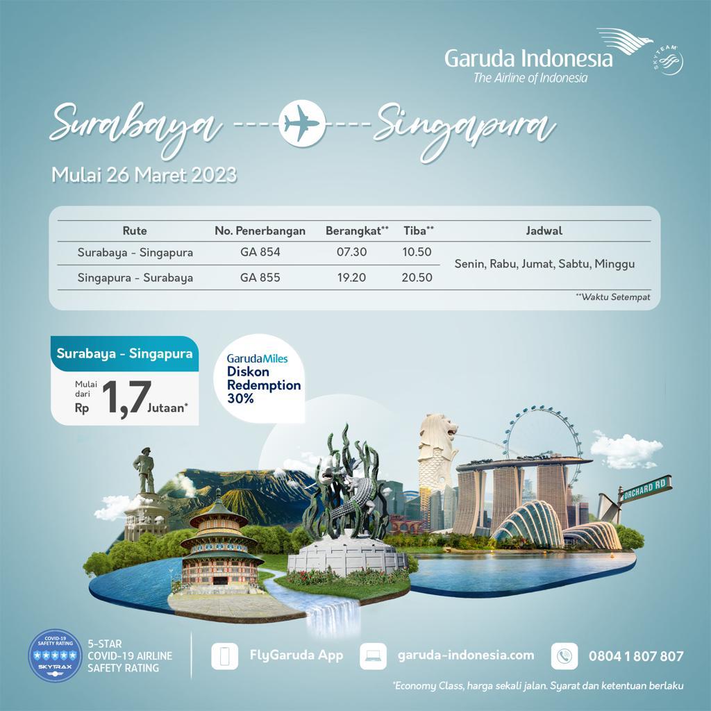 Rute penerbangan Singapura – Surabaya tersebut akan dilayani 5 (lima) kali setiap minggunya yaitu dengan menggunakan armada B737-800NG yang memiliki kapasitas sebanyak 12 penumpang kelas bisnis dan 150 penumpang kelas ekonomi. Penerbangan Singapura – Surabaya dilayani dengan GA 855 dan diberangkatkan dari Bandara Internasional Changi pada pukul 19.20 LT dan tiba di Surabaya pada pukul 20.50 WIB. Sementara penerbangan Surabaya – Singapura dilayani dengan GA 855 dan diberangkatkan dari Bandara Internasional Juanda Surabaya pada pukul 07.30 WIB dan akan tiba di bandara internasional Changi pada pukul 10.50 LT.