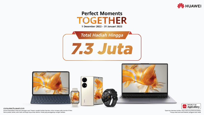 beritaKUH- Menyambut rangkaian semarak keceriaan musim liburan Natal dan Tahun Baru, Huawei Device Indonesia menghadirkan sebuah kampanye besar bertajuk Perfect Moments Together, yang berlangsung pada periode 1 Desember 2022 hingga 31 Januari 2023. Kampanye ini bertujuan untuk mengajak pelanggan untuk mengisi momen bahagia ini dengan menghadiahkan diri sendiri, keluarga, dan orang-orang yang dicintai guna menciptakan momen tak terlupakan dengan berbagai perangkat terbaik dari Huawei. Selama kampanye ini berlangsung, Huawei telah menyediakan hadiah spesial dengan total senilai Rp7,3 Juta serta berbagai diskon menarik untuk berbagai produk HUAWEI.