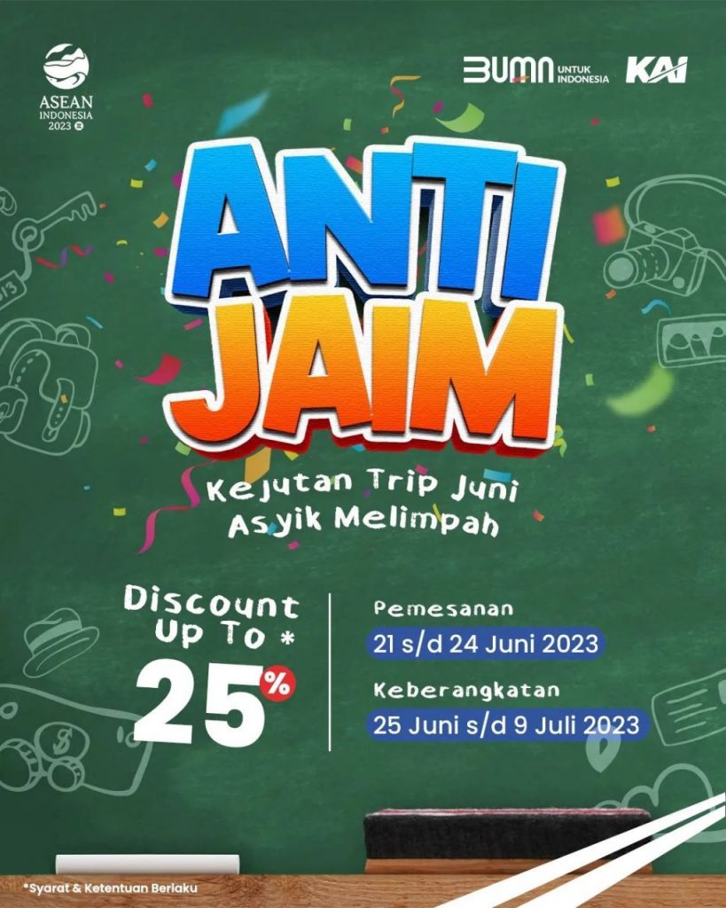 beritaKUH- PT Kereta Api Indonesia (Persero) menghadirkan promo Anti Jaim (Kejutan Trip Juni Asyik Melimpah) dimana masyarakat dapat membeli tiket kereta api jarak jauh dengan diskon hingga 25 persen. Masyarakat dapat membeli tiket promo ini pada tanggal 21 – 24 Juni 2023 untuk keberangkatan periode libur kenaikan kelas yaitu tanggal 25 Juni – 9 Juli 2023. Tiket dapat dibeli melalui aplikasi KAI Access, situs kai.id, ataupun seluruh chanel penjualan tiket yang bekerja sama dengan KAI.