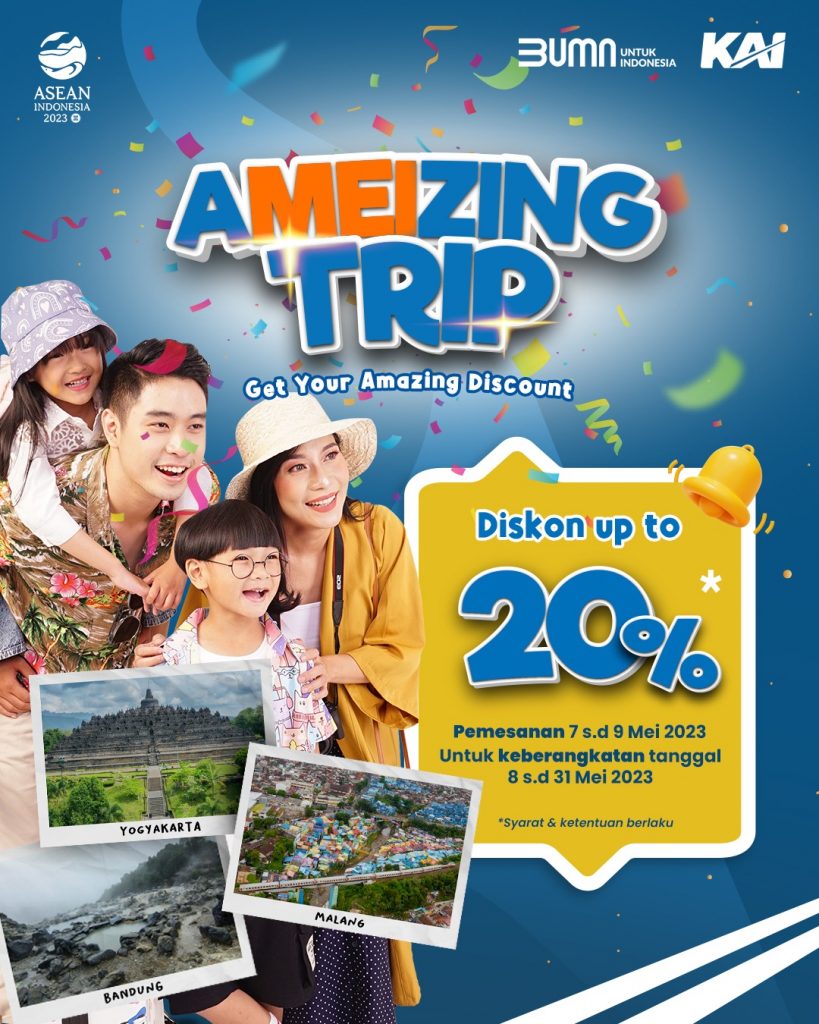 beritaKUH-PT Kereta Api Indonesia (Persero) menghadirkan promo Ameizing Trip, dimana masyarakat dapat membeli tiket kereta api dengan diskon hingga 20% dari subkelas terendah yang dibuka. Promo ini berlangsung pada tanggal 7 – 9 Mei 2023 untuk keberangkatan tanggal 8 – 31 Mei 2023. Tiket dapat dibeli melalui aplikasi KAI Access, situs kai.id, ataupun seluruh chanel penjualan tiket yang bekerja sama secara resmi dengan KAI.