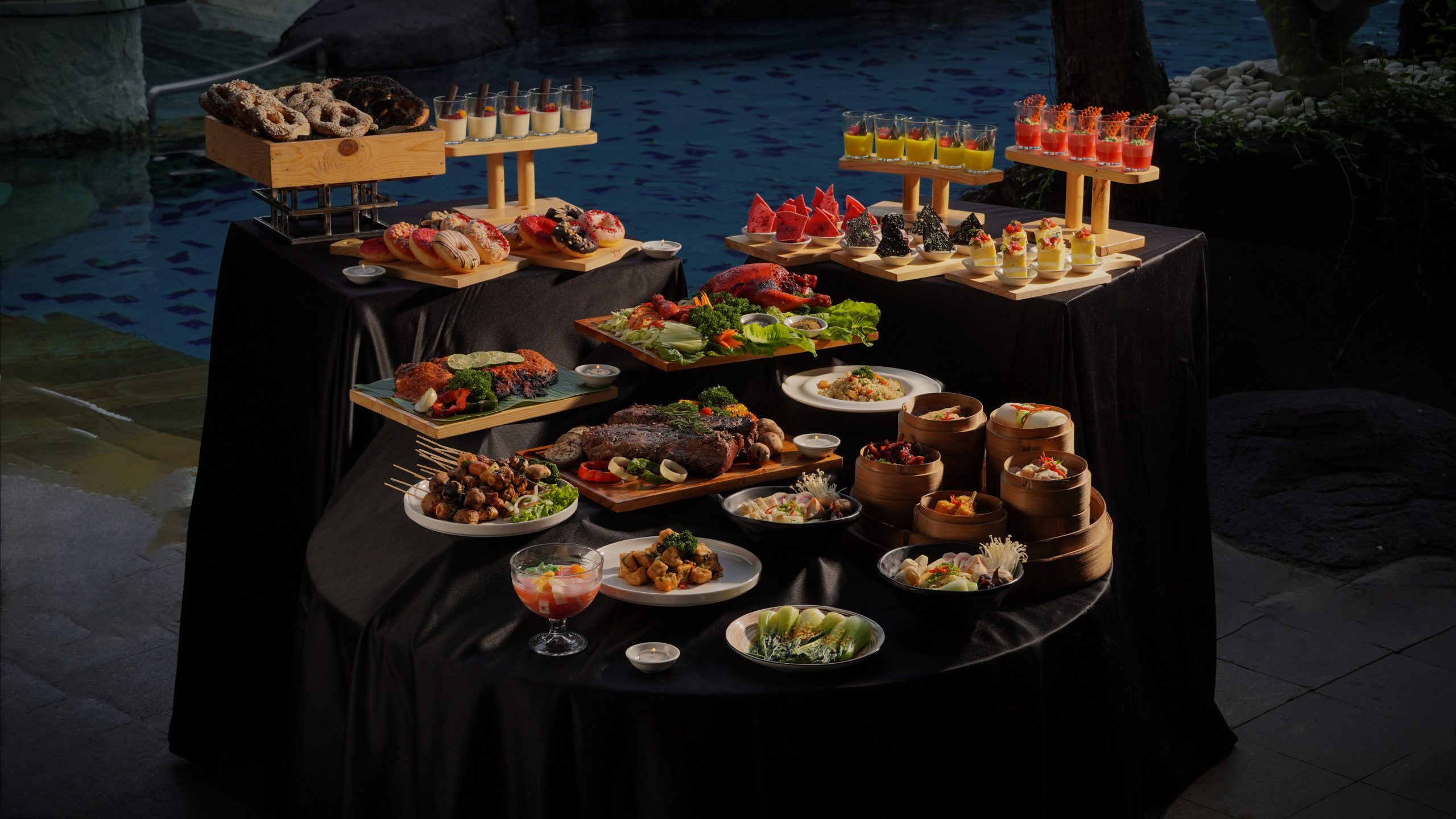 Pengunjung akan dibebaskan menyantap semua menu yang ada dalam kurun waktu 3 jam, mulai pukul 18.00 – 21.00 WIB ditemani dengan alunan live musik. Hanya dikenakan biaya sebesar Rp 158.000 net/orang. Terletak di poolside Tropical Swimming Pool.