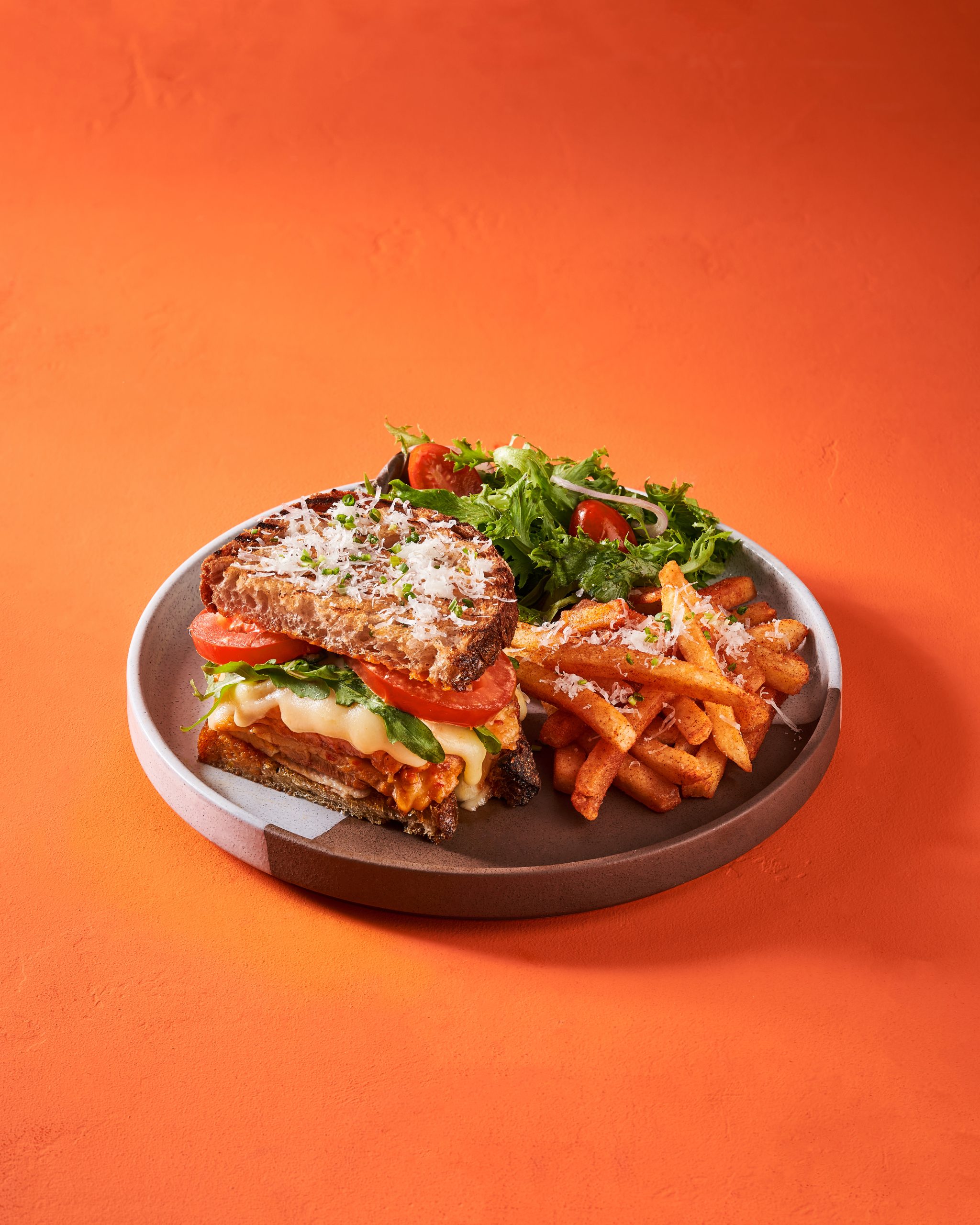 ● Chicken Parmigiana Sandwich: Ciabatta rustic dengan schnitzel ayam goreng, dilumuri saus tomat berwarna merah muda, keju mozzarella, dan mayones.