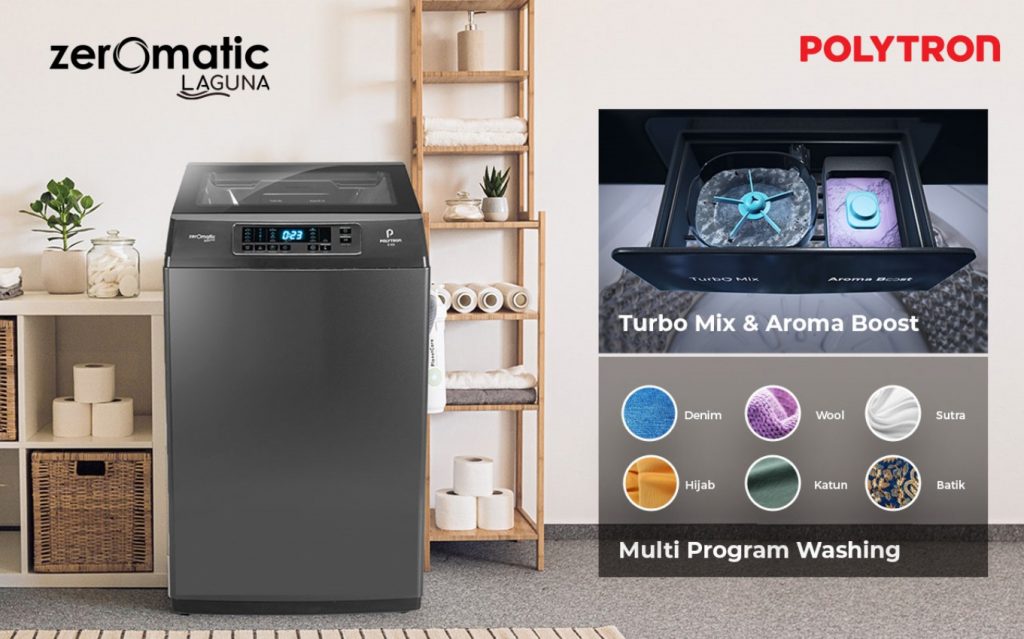 POLYTRON telah merilis kepasaran mesin cuci Zeromatic Laguna, yang selain bisa mencuci pakaian menjadi bersih maksimal, Zeromatic Laguna juga mampu menjaga serat kain tetap awet dan menghasilkan cucian yang wangi.
