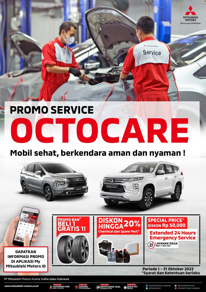 beritaKUH- Menyambut bulan Oktober 2022, PT Mitsubishi Motors Krama Yudha Sales Indonesia (MMKSI) melanjutkan fasilitas purna jual yang memudahkan para pengguna kendaraan Mitsubishi Motors dalam melakukan perawatan kendaraanya melalui “Octocare Campaign”. “Octocare Campaign” merupakan kampanye dengan program dan penawaran menarik untuk menunjang perawatan kendaraan konsumen di bengkel resmi Mitsubishi Motors yang berlangsung selama 1-30 Oktober 2022.