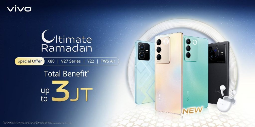 Konsumen masih bisa menikmati program vivo ‘Ultimate Ramadan’ untuk membeli vivo V27 Series, vivo X80, vivo Y22, dan vivo TWS Air dengan berbagai penawaran menarik hingga tanggal 30 April 2023 secara eksklusif lewat kanal offline dan online resmi milik vivo maupun mitra e-commerce resmi vivo.