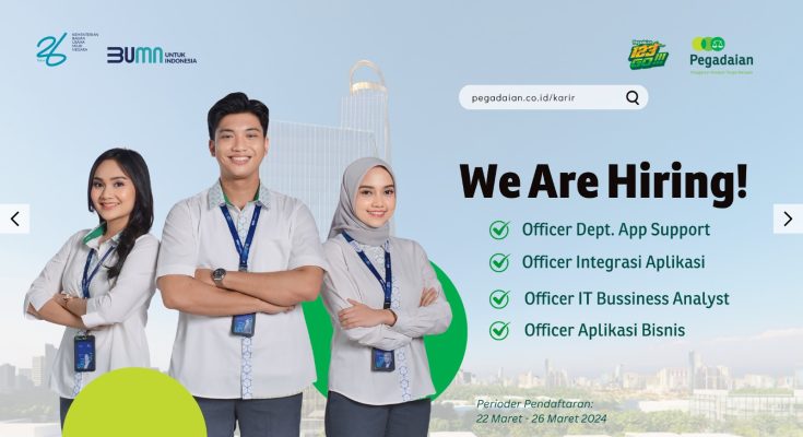 beritaKUH- PT Pegadaian kali ini buka lowongan kerja bagi para lulusan di bidang IT. Untuk lulusan S1 yang tertarik bekerja sebagai Entry Level sampai dengan mid level officer di bidang aplikasi dan business analyst.