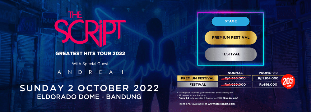 Buat semua #TheScriptFamily di Bandung dan sekitarnya, acara Ini akan menjadi sebuah tur yang akan memorable bersama The Script dengan opening act ANDREAH, jadi jangan sampai terlewatkan. Tiket resmi Promo Program 9.9 dapat diperoleh melalui Otelloasia.com