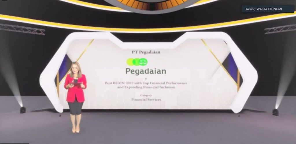 beritaKUH- PT Pegadaian berhasil meraih penghargaan Best BUMN 2022 untuk kategori Financial Services with Top Financial Performance and Expanding Financial Services, dalam acara yang diselenggarakan oleh Warta Ekonomi secara virtual, (pada Rabu (30/11).