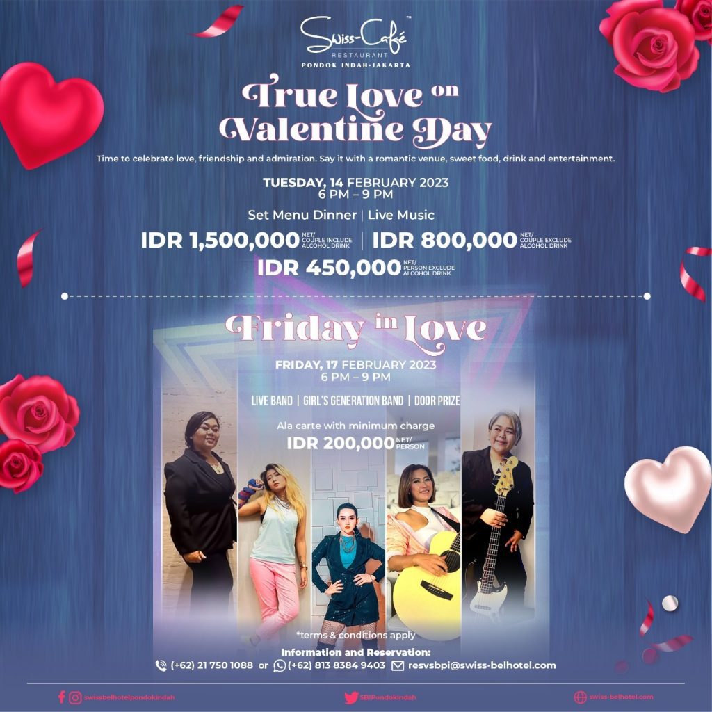 Tak berhenti disitu, Swiss-CaféTM Restaurant juga telah menyiapkan perayaan  Valentine bagi seluruh tamu yang hadir pada hari Jumat, 17 Februari 2023 pukul 18.00  – 21.00 wib, dengan menghadirkan penampilan musik hidup spesial dimana para  pemainnya seluruhnya perempuan. Hanya dengan minimum purchase Rp200.000 net  per orang, anda berkesempatan mendapatkan door prize pada hari tersebut.