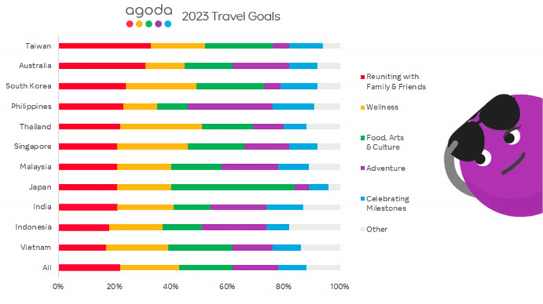 Taiwan (33%), Australia (31%), dan Amerika Serikat (25%) adalah destinasi yang cenderung dipilih oleh wisatawan yang akan merencanakan reuni liburan dengan keluarga atau teman. Namun, wisatawan dari beberapa negara lain memiliki alasan berbeda mengapa mereka mulai melakukan perjalanan. Korea Selatan, Thailand, dan Singapura misalnya, recharging mental dan fisik menjadi alasan utama, menjadikan wellness di posisi ke dua sebagai ‘alasan untuk bepergian’ dari survei Travel Trend Agoda.