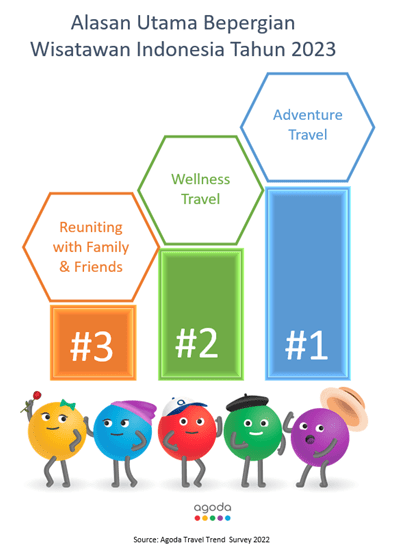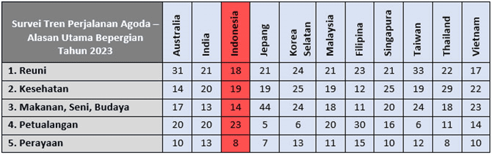 Hasilnya, bertemu kembali dengan orang yang dicintai, wellness dan makanan, serta seni & budaya menjadi tiga alasan teratas bepergian, sedangkan mencari petualangan dan perayaan menjadi pelengkap lima besar tujuan utama untuk melakukan perjalanan.