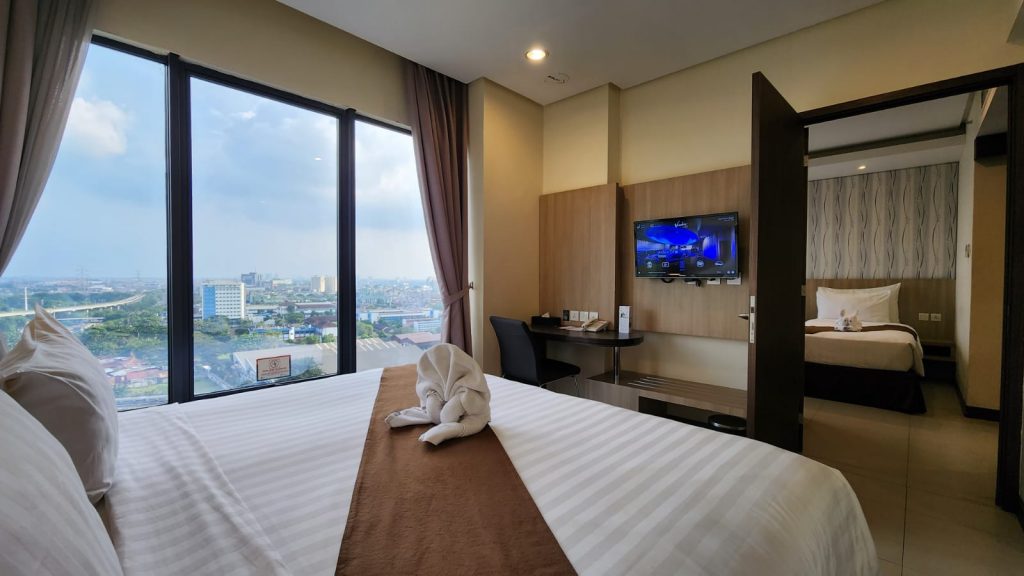 Paket menarik dan lengkap tersebut adalah Blissful Eid Room Package dengan berbagai pilihan paket, Room Only hanya Rp388.000,- net/ kamar/ malam dan Room & Breakfast hanya Rp488.000,- net/ kamar/ malam. Selain itu ada paket dengan benefit lengkap mulai dari Room Entertainment Smart TV (Netflix, Disney Hotstar, Youtube); sudah termasuk sarapan, makan siang, dan makan malam untuk 2 orang; paket laundry (5 pcs), serta free upgrade ke Executive Room dan yang tak kalah menarik adalah Kid’s Activities Corner lengkap dengan berbagai aktivitas seperti playground, games, play sand, coloring, dan free cotton candy di area lobby hotel. Serta tersedia connecting room yang sangat cocok untuk quality time menginap bersama keluarga besar. Paket lengkap tersebut hanya di bandrol harga Rp1.588.000,- net/ kamar untuk 2 malam, sedangkan untuk 3 malam hanya Rp2.988.000,- net/ kamar. Dengan lokasi yang sangat strategis yang terletak di Segitiga Emas, yang bersimpangan menuju berbagai daerah yaitu Bekasi- Bogor, Jakarta, dan Tanjung Priok, serta yang paling menarik adalah lokasi hotel berdekatan dengan Bandara Halim Perdana Kusuma, Taman Mini Indonesia Indah dan Pusat Belanja PGC.
