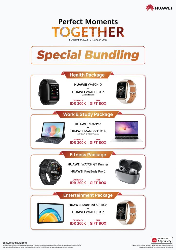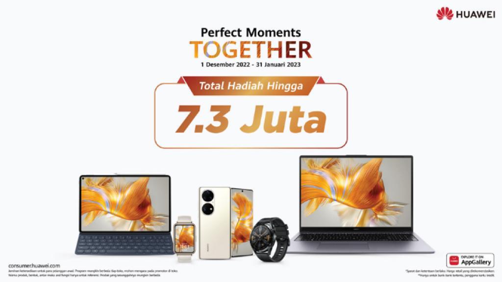 Lewat rangkaian kampanye ‘Perfect Moments Together’, pelanggan dapat membeli berbagai perangkat terbaik Huawei dengan potongan langsung 70%, cashback hingga jutaan rupiah, dan hadiah spesial dengan total hingga Rp 7,3 Juta selama periode 1 Desember 2022 hingga 31 Januari 2023. Baik sebagai kado maupun apresiasi atas segala pencapaian di tahun lalu, atau untuk semakin membantu Anda mencapai resolusi tahun baru, Huawei siap menemani dengan teknologi terbaik di berbagai skenario kehidupan Anda.