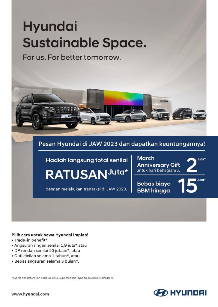 Astrid Ariani Wijana, Head of Marketing Department PT Hyundai Motors Indonesia, mengatakan, “Melihat JAW 2023 dan Ramadan yang hadir pada bulan Maret hingga April 2023, HMID menjadikannya sebagai momentum untuk memperkuat komitmen perusahaan dalam memberikan layanan yang melebihi ekspektasi konsumen. Hal ini kami wujudkan dengan pengalaman test drive yang lebih memuaskan hingga pembelian unit kendaraan yang lebih menguntungkan, khususnya untuk model STARGAZER dan CRETA sebagai lini produk Hyundai yang paling diminati konsumen Indonesia.”Simak ragam program dari HMID dalam menyambut JAW 2023 dan Ramadan: