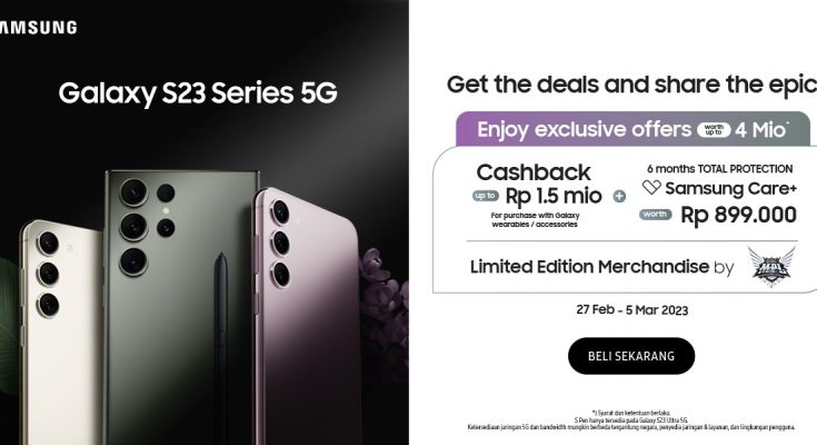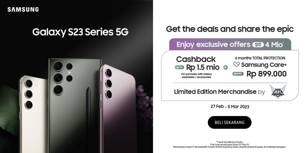 Demi memberikan keuntungan lebih bagi pelanggan, Blibli juga telah menyiapkan berbagai benefit di setiap pembelian Galaxy S23 Series 5G. Pelanggan bisa mendapatkan cashback hingga Rp1.500.000, paket perlindungan Samsung Care+ senilai Rp 899.000, serta bonus casing seharga Rp 499.000. Selain itu, untuk pelanggan online Blibli juga menyediakan merchandise eksklusif dari MPL Indonesia (Mobile Legends Profesional Liga Indonesia) bagi pelanggan yang melakukan pembelian Galaxy S23 Series 5G.